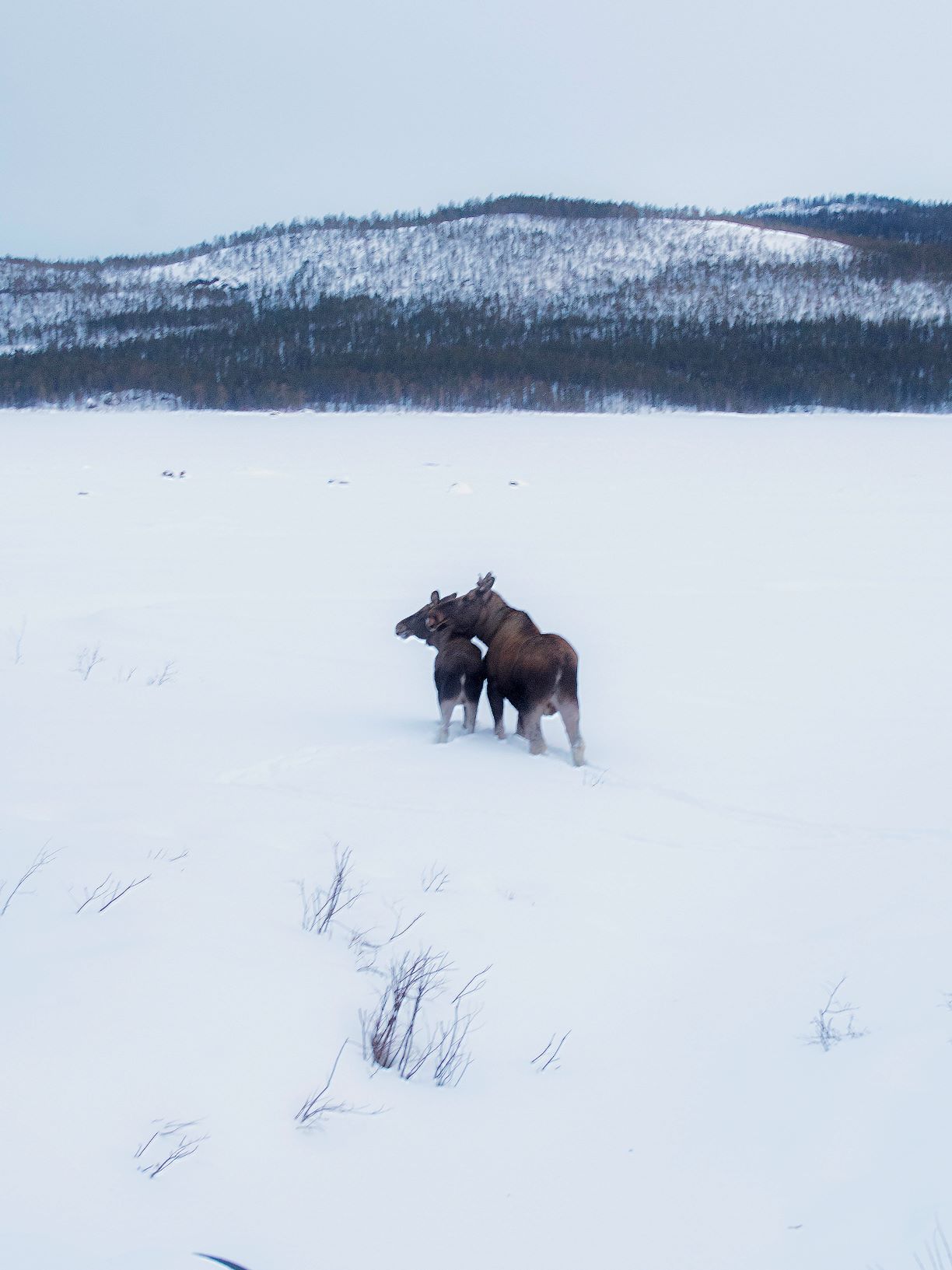 Gli altri giorni si sono susseguiti un po’ nella veranda fotografica, un po’ gironzolando tra le bianche distese alla ricerca delle alci, sempre con la speranza di catturare l’aurora boreale.