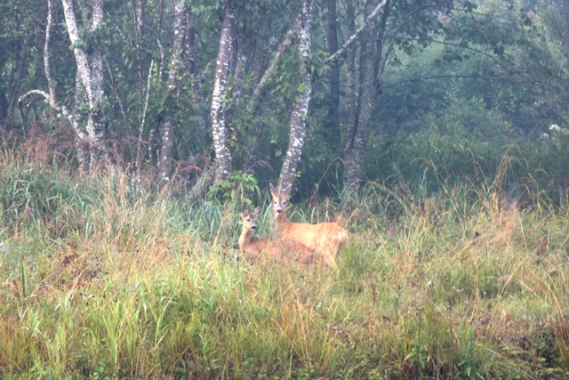Osserviamo anche i più riservati caprioli, ma è indubbio che l’incontro più spettacolare è quello con un grosso maschio di alce, che già da sdraiato ci sembrava enorme, ma poi ritto ci ha lasciato sbalorditi per la sua possanza.