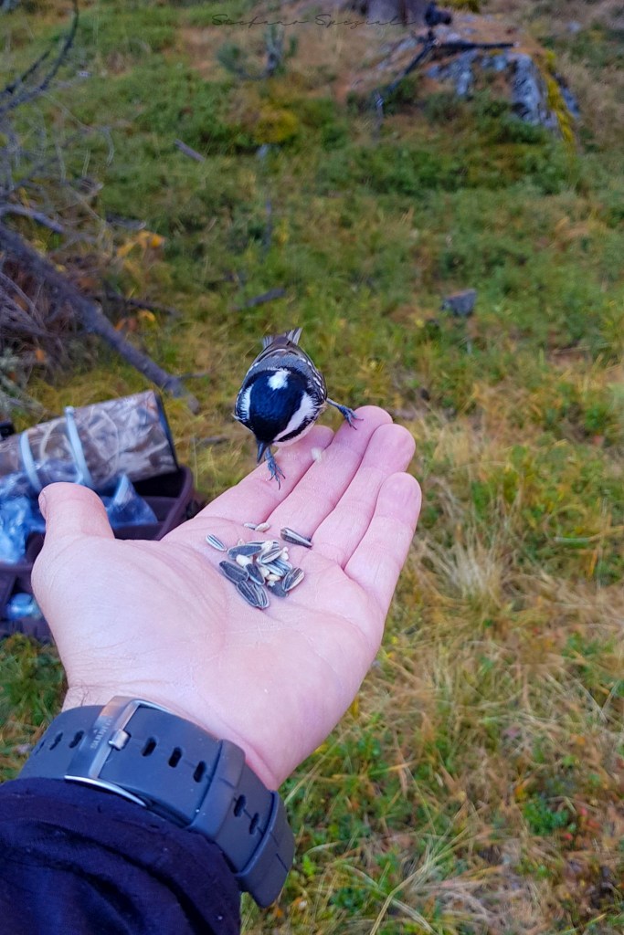 Addirittura le nocciolaie (Nucifraga caryocatactes), altrove piuttosto schive, qui si fanno conquistare da un pugno di nocciole.