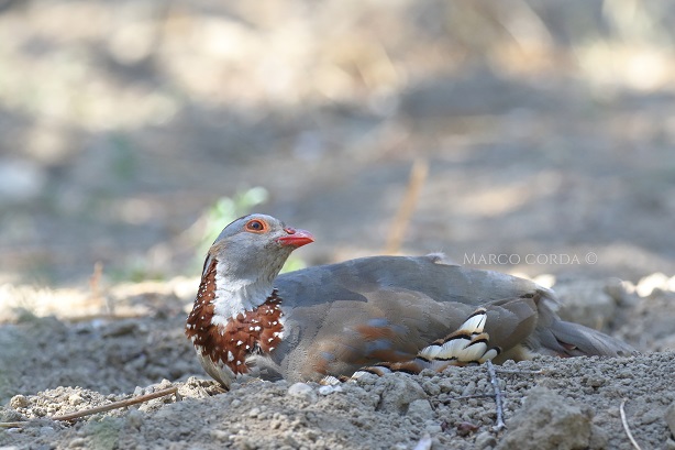 Placata la sete i pulcini iniziano a scorrazzare attorno al capanno, è veramente impossibile riuscire ad averli tutti sott’occhio e solo ora comprendo le apprensioni dei genitori. Questi ultimi, una volta rassicurati, si concedono una rapida abbeverata, chinando il capo solo per poche frazioni di secondi. Totalmente rassicurata, la femmina si concede un terapeutico bagno di sabbia per allontanare i fastidiosi parassiti che infestano il piumaggio.