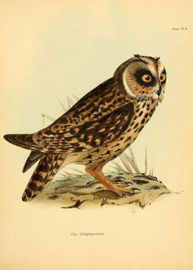 Ecco come Charles Darwin descrisse i rapaci notturni della Galapagos: “Raccolsi ventisei specie di uccelli terrestri, tutte peculiari dell’arcipelago e assenti altrove, ad eccezione di un fringuello simile a un’allodola del Nordamerica (Dolichonyx oryzivorus), che è diffuso su questo continente verso nord fino a 54° di latitudine e frequenta generalmente le paludi. Gli altri venticinque uccelli sono: primo, un falco, intermedio in modo curioso per la sua struttura fra una poiana e il gruppo americano dei Polyborus mangiatori di carogne (e con questi ultimi concorda molto strettamente in ogni costume e persino nel tono della voce). Secondo: due rapaci notturni corrispondenti al gufo di palude e al barbagianni dell’Europa”.