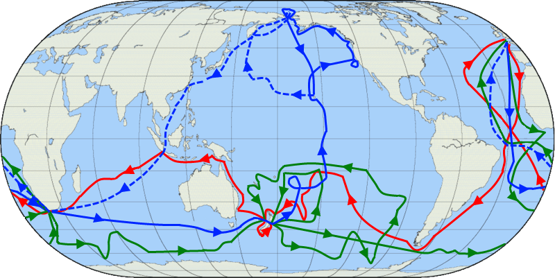 Le rotte dei viaggi di James Cook. Il primo viaggio è mostrato in rosso, il secondo in verde, il terzo in blu