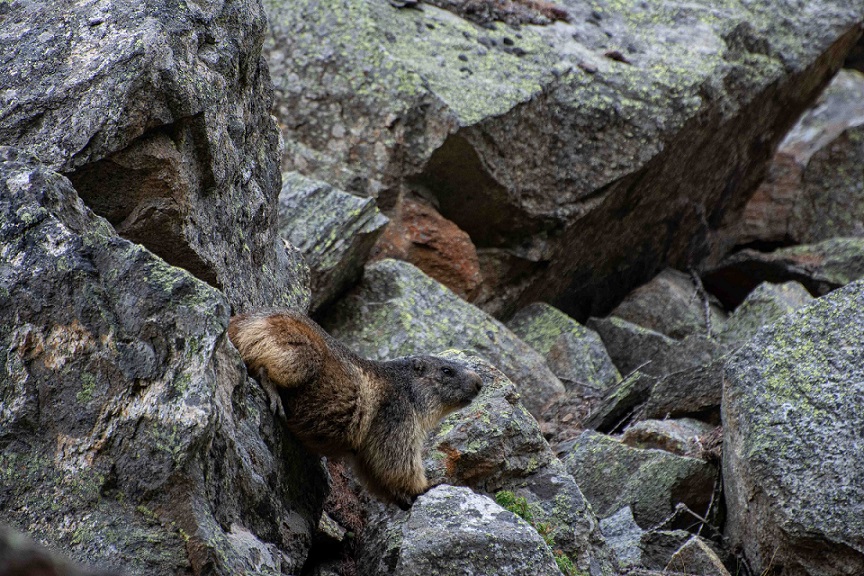 Maestose ma lontane, speriamo di poterle apprezzare più da vicino. Nei pressi di Valmaniaz, tra gli alberi e la bassa e fitta vegetazione, ecco finalmente i primi incontri ravvicinati! Alcuni camosci alpini (Rupicapra rupicapra), molto confidenti, alcune marmotte (Marmota marmota) e diversi uccelli che sfrecciano tra i rami.