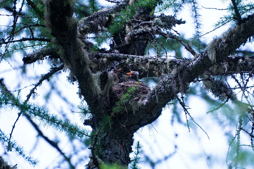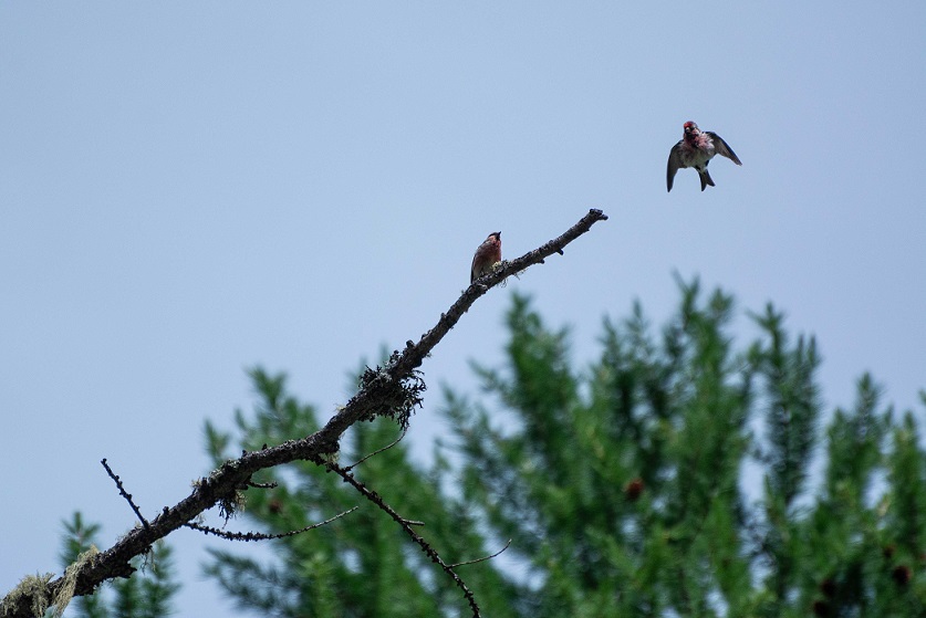 Riconosciamo alcuni fanelli (Linaria cannabina) e scorgiamo un nido di cesene (Turdus pilaris) che la madre con grande aggressività difende dalla presenza preoccupante di alcuni corvi neri (Corvus frugilegus).