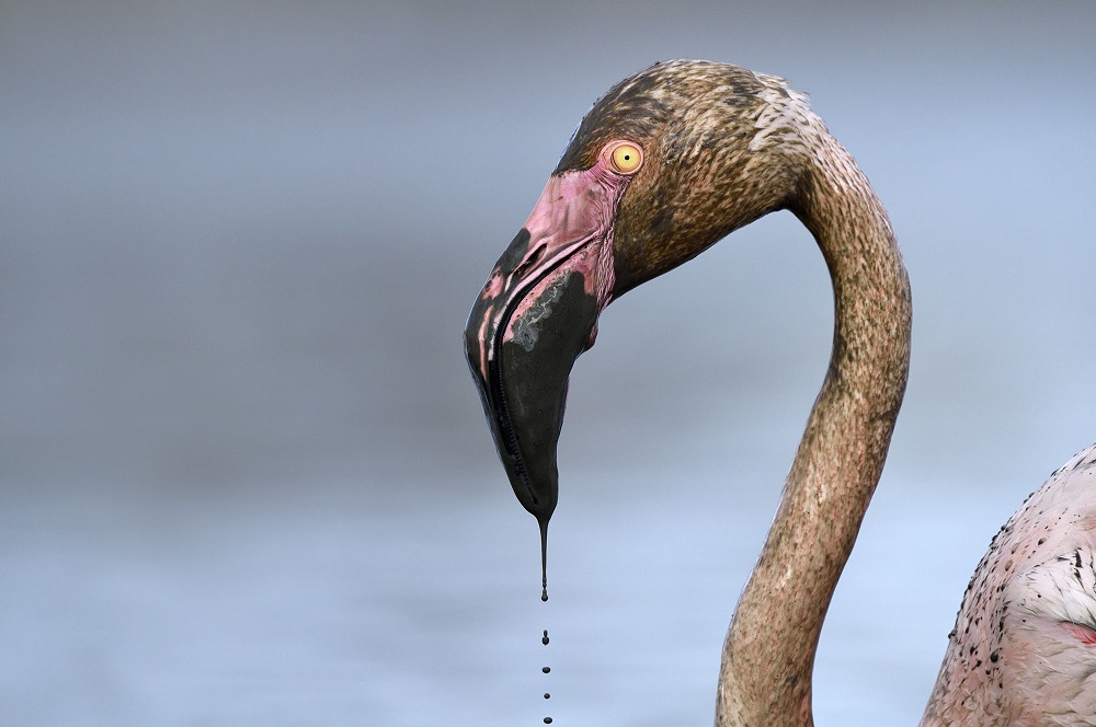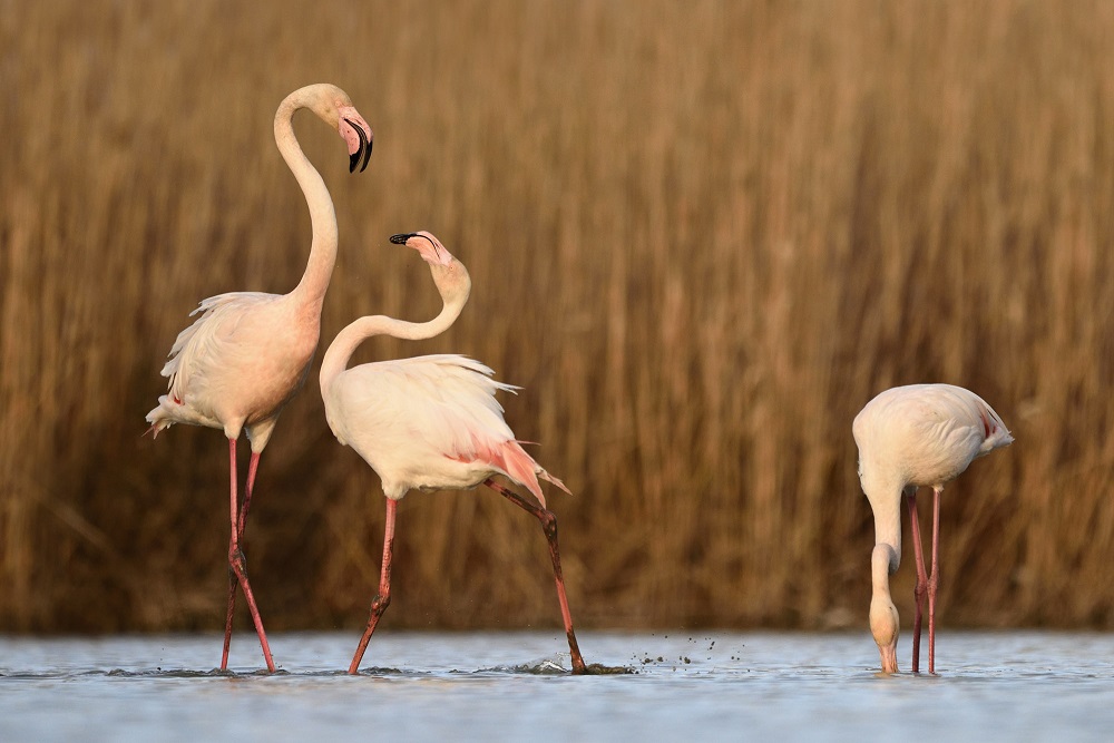 Trampolieri dall’aspetto inconfondibile, che avanzano dinoccolati sulle loro lunghe zampe e setacciano di continuo il fondale limaccioso con un movimento ritmico del capo, alla ricerca dei microrganismi di cui si nutrono. Le sfumature rosa del loro piumaggio derivano dai carotenoidi, pigmenti ereditati da piccoli crostacei di cui i fenicotteri si alimentano e che a loro volta ottengono i pigmenti cibandosi di alghe che ne sono ricche.