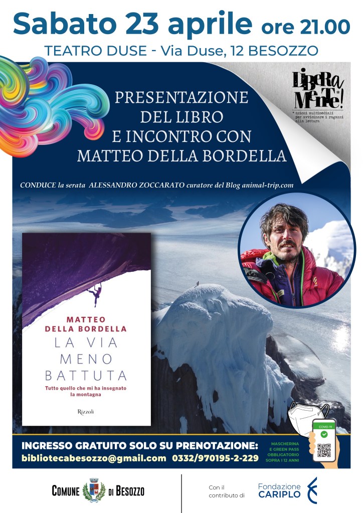 Sabato 23 aprile alle 21.00 al Teatro Duse di Besozzo(VA), l’alpinista ed esploratore di fama internazionale Matteo Della Bordella presenterà il suo libro edito da Rizzoli “La via meno battuta”. Un appuntamento voluto dall’Assessorato alla Cultura del Comune di Besozzo in cui ci racconterà con parole, immagini e filmati le sue esperienze degli ultimi anni.