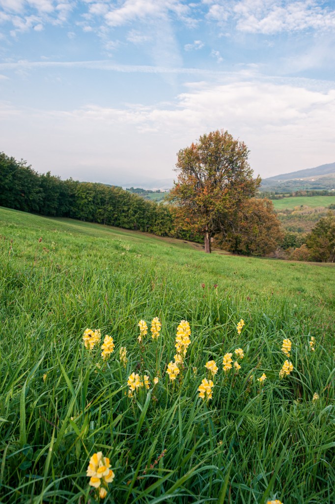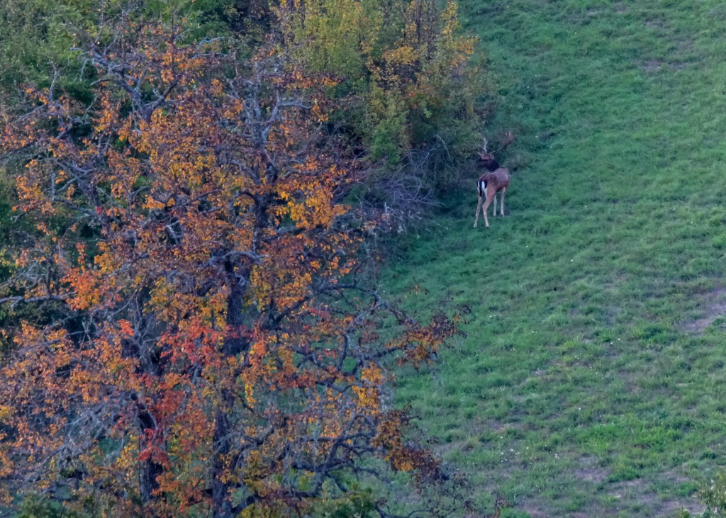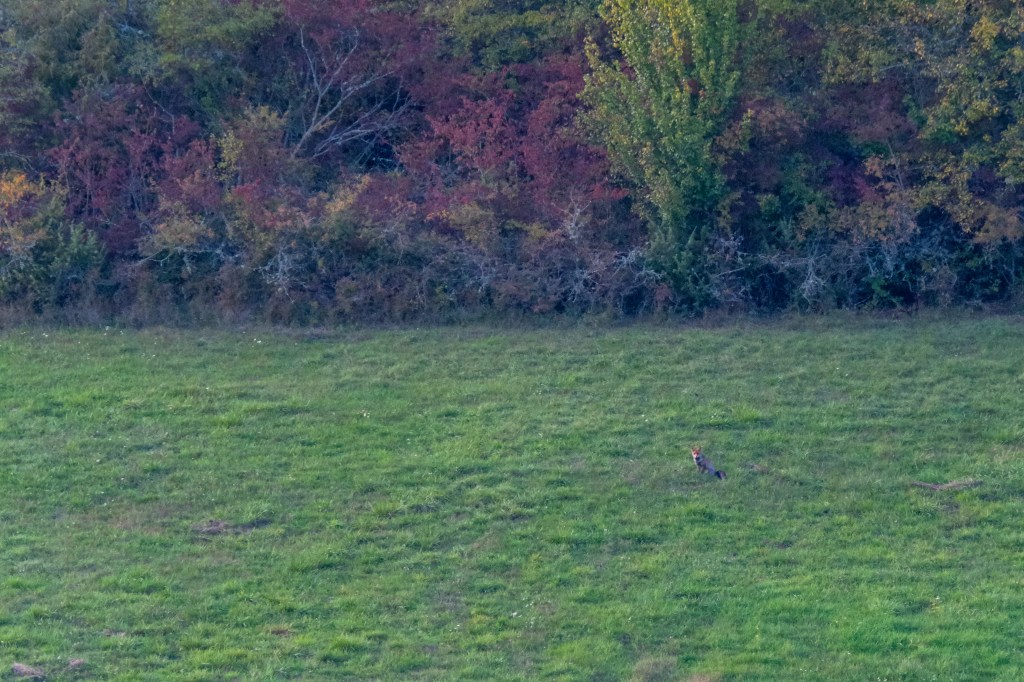 C’è una volpe seduta in mezzo al prato intenta a godersi il panorama e gli ultimi raggi di sole. Da una lingua di bosco arrossato dall’autunno escono dei daini, un giovane maschio e delle femmine. Sfortunatamente sono molto distanti, impreco contro la mia inettitudine a maneggiare il binocolo finché non trovo il fuoco e mi godo queste tre figure, giusto per pochi minuti. Dal sentiero ai loro piedi infatti spunta un folto gruppo di escursionisti, almeno una quindicina e in un battibaleno gli animali si dileguano. La sfortuna non cammina mai da sola…