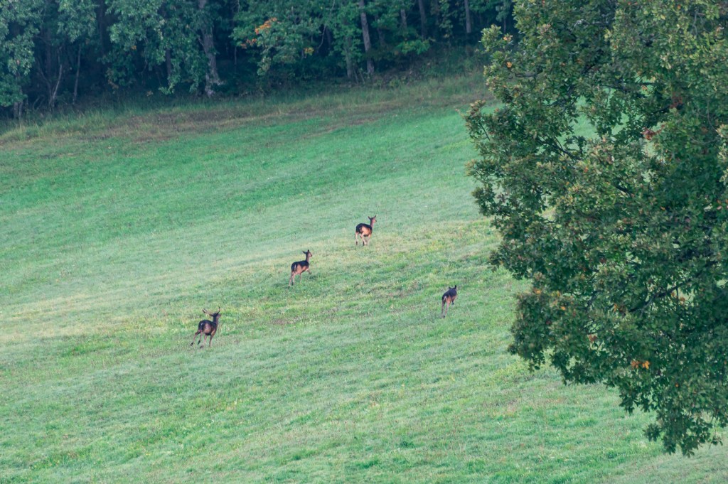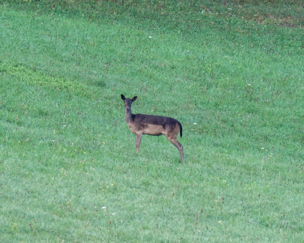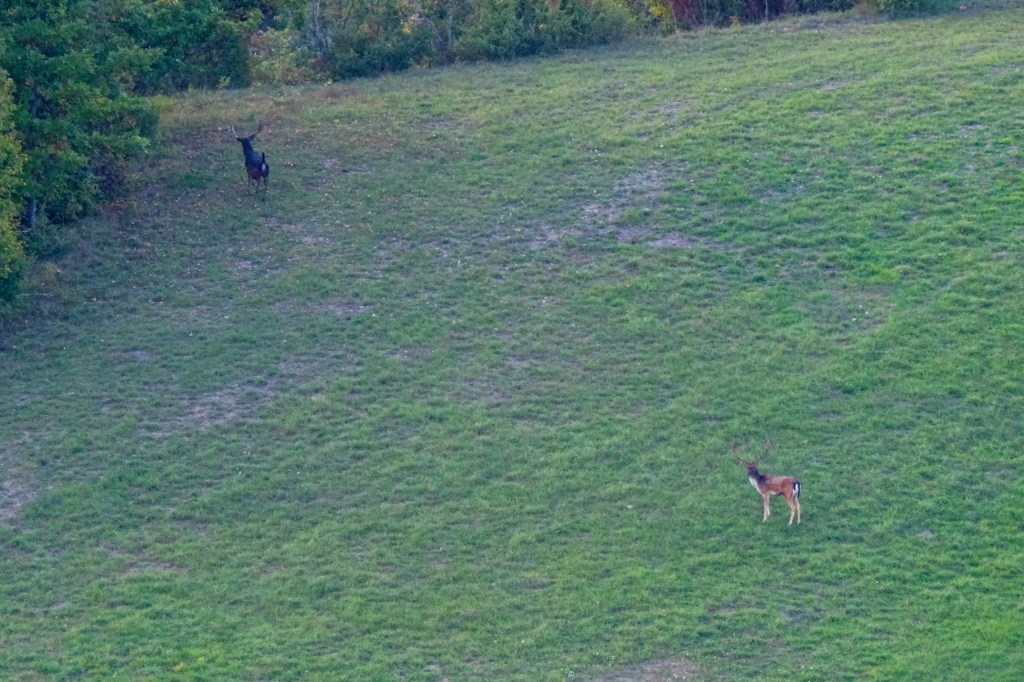 Scollinando sorprendiamo i primi daini, delle femmine intente a brucare e più in basso sulla destra un balestrone melanico (qui sono molto frequenti). Ci godiamo l’affascinante mantello scuro che gli dona un’aura di mistero finché non ci nota e si avvia verso gli alberi.