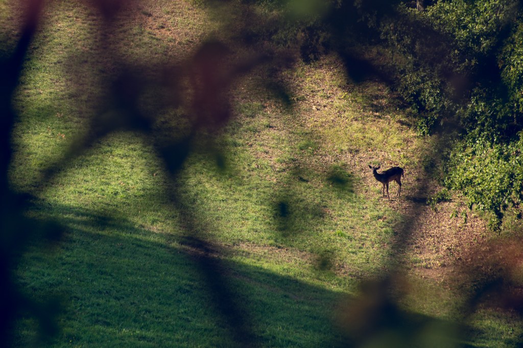 Volgo lo sguardo a sinistra verso un’altra collina ed esattamente, come lo avesse posizionata uno scenografo, sotto l’enorme sfera luminosa si staglia la silouette di un grosso maschio di daino. Una visione.