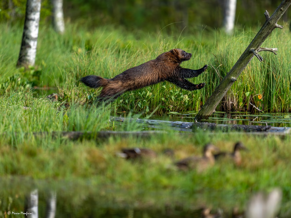 Ghiottone con riflesso (F 2.8 1/1000 s ISO 800 a 400mm). L’ambientazione intorno al lago permette di ottenere scatti del ghiottone anche con il riflesso nell’acqua