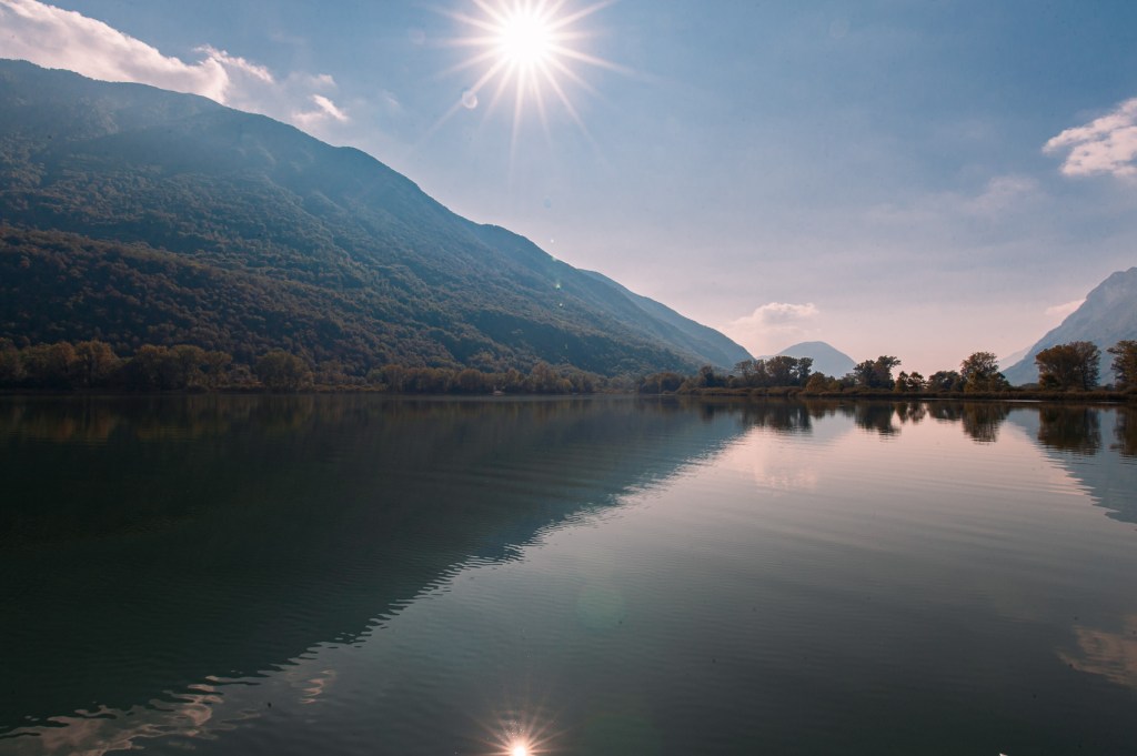 Dietro di noi l’acqua, il sole e altre montagne. Lo spettacolo sarebbe già soddisfacente così ma il lago regala ancora sorprese. Fruscii, scalpitii, rami che si spezzano. Qualcosa è lì dietro a pochi metri e si sta muovendo.