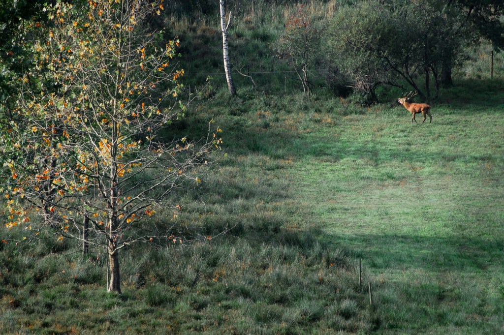 Costeggiamo un grande prato con in lontananza, sotto un albero, un giovane, regale maschio che punta verso il bosco. Mi da il tempo questa volta di scattare due foto.
