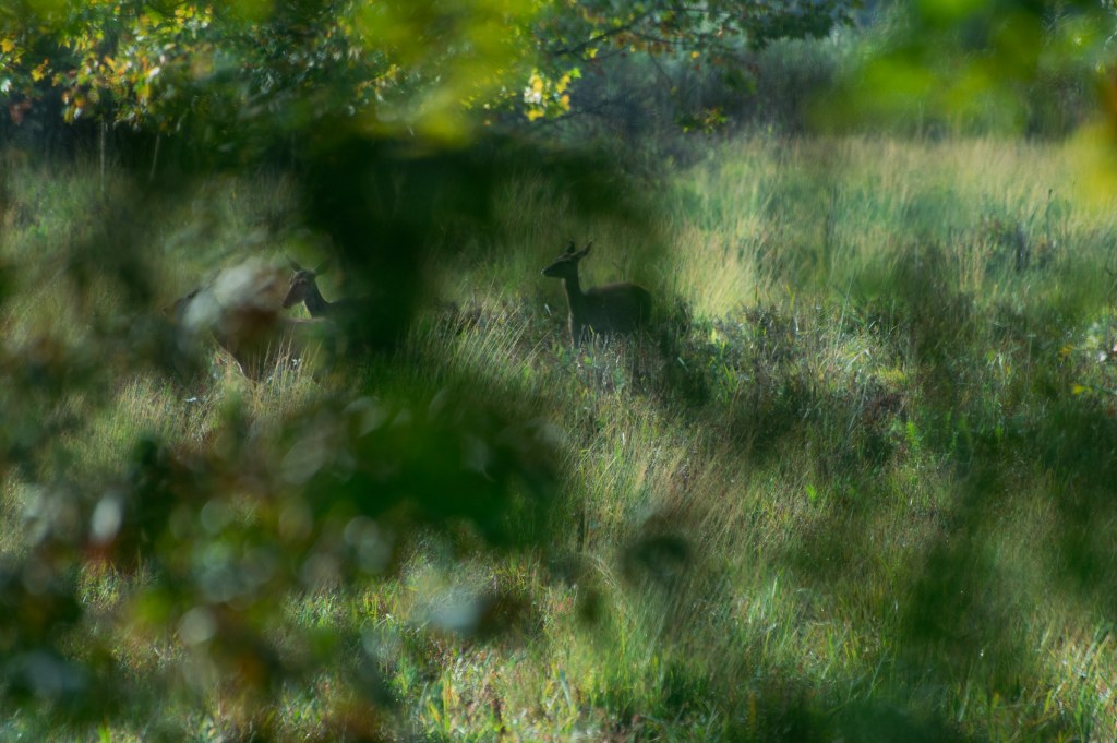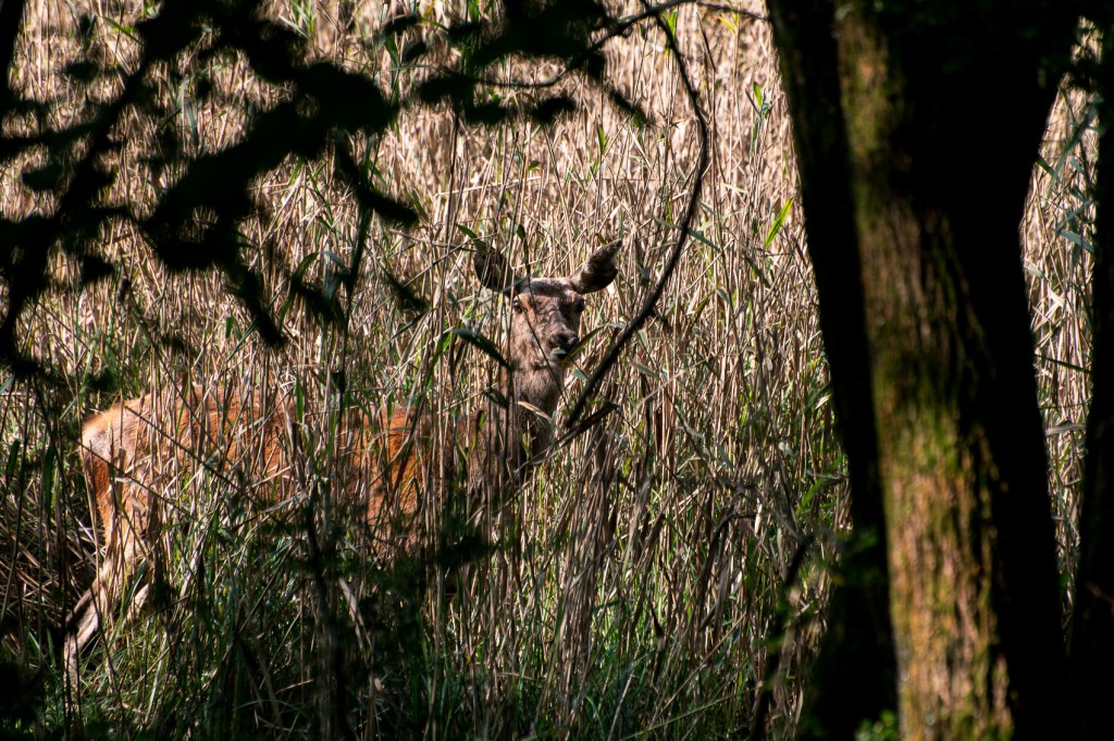 Il sentiero ad anello (due ore abbondanti senza pause) costeggia il lago per poi, a tratti, allontanarsi di poco verso i boschi e ritornare nuovamente a costeggiare le sponde; li sentiamo sempre più vicini. Nei giorni precedenti guardando Google Maps abbiamo identificato un paio di zone aperte che potrebbero essere il palcoscenico ideale per questa lotta a suon di vocalizzi. Puntiamo verso il primo, la zona degli antichi mulini. I versi sono sempre più fragorosi; procediamo a passo spedito, tendiamo le orecchie, volgiamo lo sguardo ad ogni prato che si alterna ad alberi, canne e zone umide. Per la prima parte del tragitto non incrociamo nulla, li udiamo ma non li vediamo. Non è la prima volta che affrontiamo questo tipo di esperienza, sappiamo perfettamente che la cosa più saggia sarebbe sedersi e aspettare con pazienza nei pressi di un campo aperto ma questa volta, come novizi, veniamo presi da troppa adrenalina e continuiamo a camminare verso questi suoni baritonali come falene verso i lampioni.