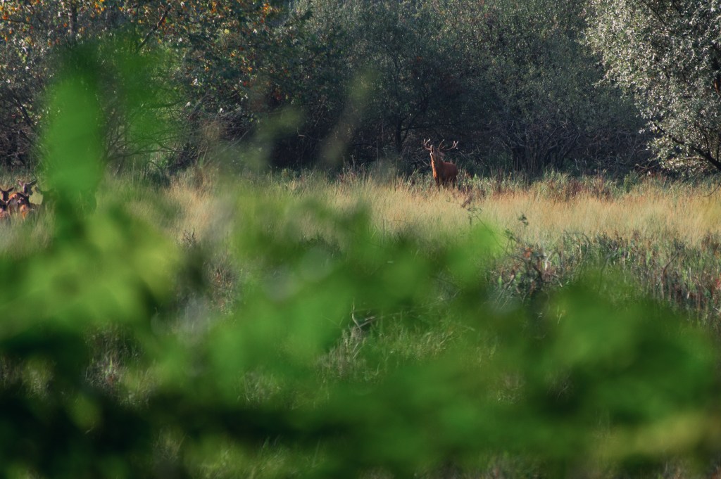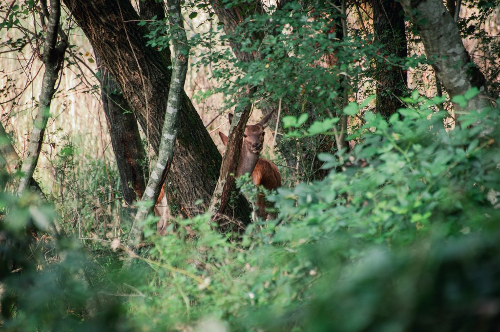 Finalmente in una zona boschiva al limitare di un canneto intravediamo tra le foglie un gruppo di femmine coi piccoli che si avviano verso una piccola radura; sono una ventina. Si muovono in fila, i giovani dietro le madri che controllano la zona. Rimaniamo immobili senza nemmeno accovacciarci protetti da fogliame e arbusti. Li perdiamo di vista dopo qualche minuto. Risuona ancora, più avanti, potente, quasi ci colpisse al petto, è terribilmente affascinante ma è anche lievemente inquietante, il tipico suono che non vorresti mai sentire di notte dopo che ti sei perso lasciando la strada, inoltrandoti nella brughiera (citazione cinematografica).