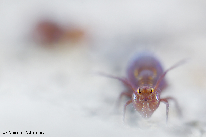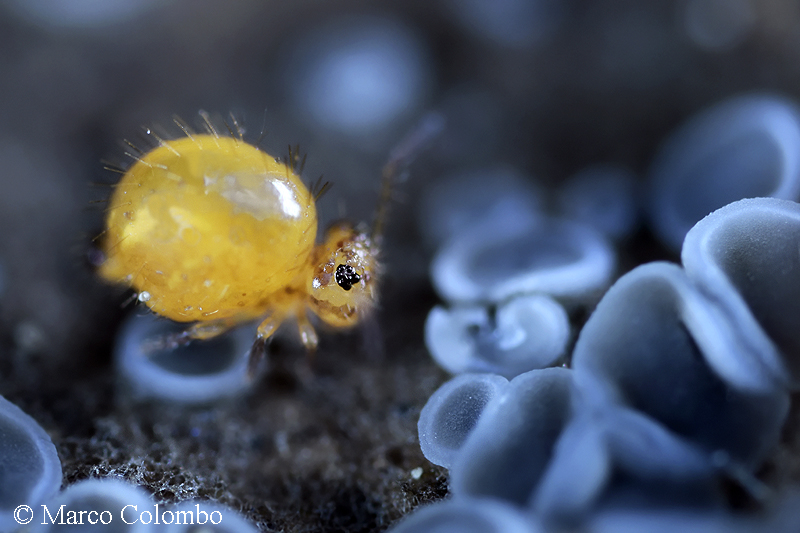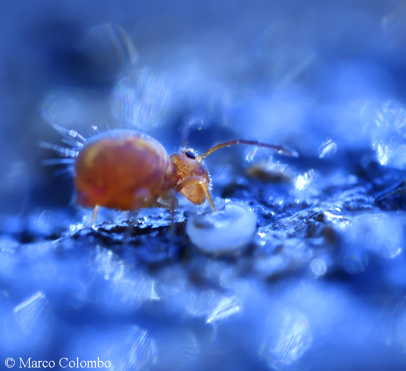 Fotografare i collemboli non è stato affatto semplice, perché parliamo di soggetti sotto i 3 millimetri di lunghezza, più spesso sotto il millimetro, fino ad alcune specie lunghe 0,25 millimetri (un quarto di millimetro!); solo una delle specie che ho fotografato, la più grande in Europa, è ben visibile ad occhio nudo, poiché raggiunge ben 9 millimetri di lunghezza. Ci sono quindi difficoltà oggettive nel vederli, nell’inquadrarli e nel ritrarli: ad esempio, la profondità di campo con ingrandimenti elevati è ridottissima, e se vuoi mettere a fuoco proprio gli occhi dell’animale, devi fare attenzione e soprattutto fotografarlo quando è fermo, ad esempio mentre mangia, pena avere le foto sfuocate. Io ho utilizzato un Laowa 25 mm che mi è stato gentilmente fornito da Image Photoconsult / Laowa Italia, e che raggiunge i 5x di ingrandimento: una sorta di microscopio ambulante!