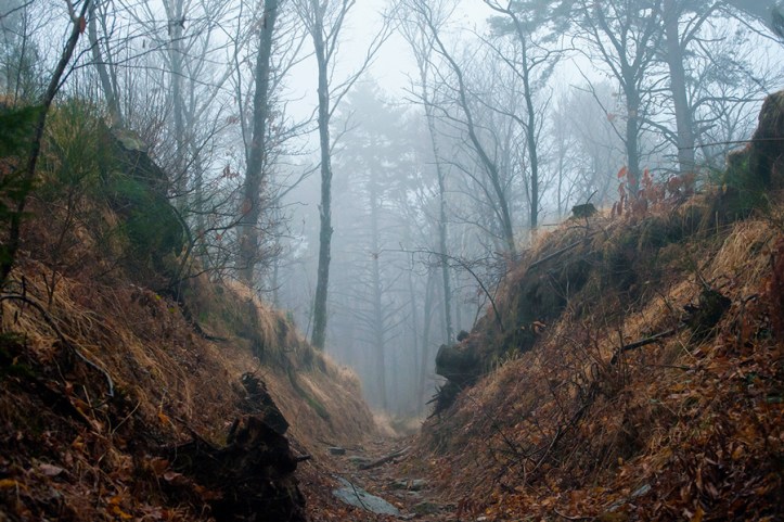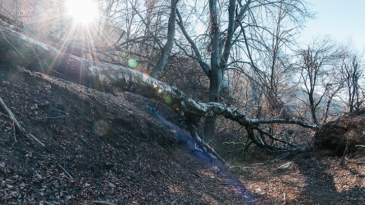 La tipica conformazione del terreno nei boschi che salgono al Campo dei Fiori, con profondi avvallamenti e molti alberi abbattuti dagli eventi meteorologici estremi degli ultimi anni