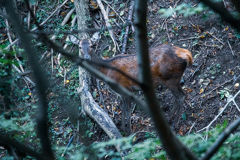 Una delle due cerve ben nascoste nel folto del bosco in ascolto del bramito