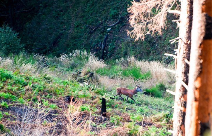 Aspettiamo una giornata con buona luce e proviamo. Ci alziamo di buon mattino ma senza esagerare. Pochi cercatori di funghi in giro – la stagione decisamente non decolla per loro – camminiamo per qualche km e finalmente ecco lontano l’eco dei primi bramiti. Sono almeno un paio di esemplari. Decidiamo di continuare, di andare oltre e salire. I bramiti si fanno sempre più forti, cerchiamo di avvicinarci silenziosamente ma il bosco è veramente difficile. Scorgiamo un paio di cerve nel folto ma purtroppo di maschi nessuno. Troviamo dei sentieri marcati dai cervi, alcuni escrementi…