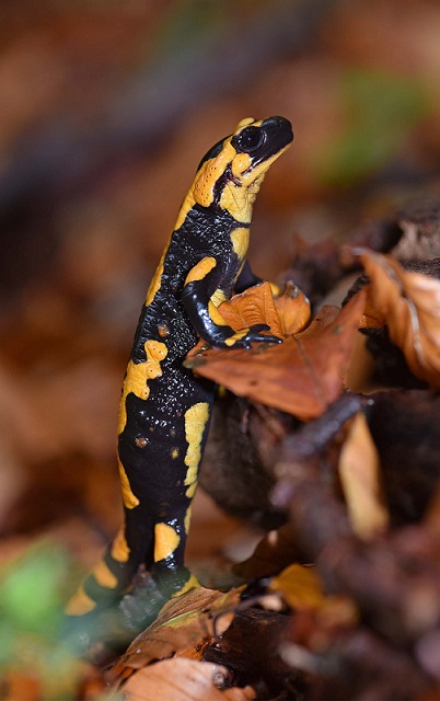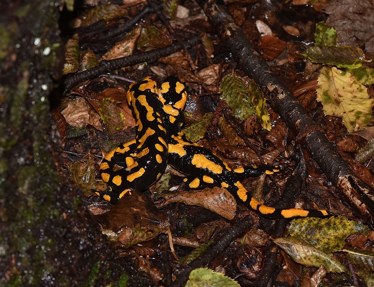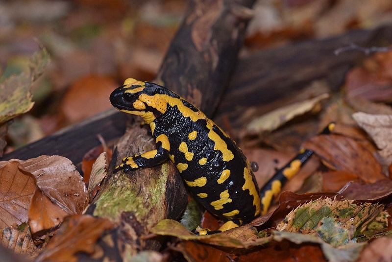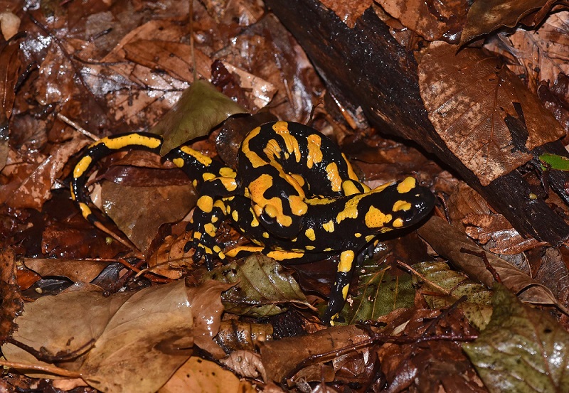 In autunno, nei giorni di pioggia, è possibile incontrare in diverse aree del nostro Paese, prevalentemente nei boschi di latifoglie, la salamandra pezzata (Salamandra salamandra), facilmente riconoscibile per il corpo nero con macchie gialle o arancio. Sulla lettiera autunnale, se resta immobile, può sfuggire alla vista ma quando si muove, con il suo andamento ondeggiante, cattura immediatamente l’attenzione.