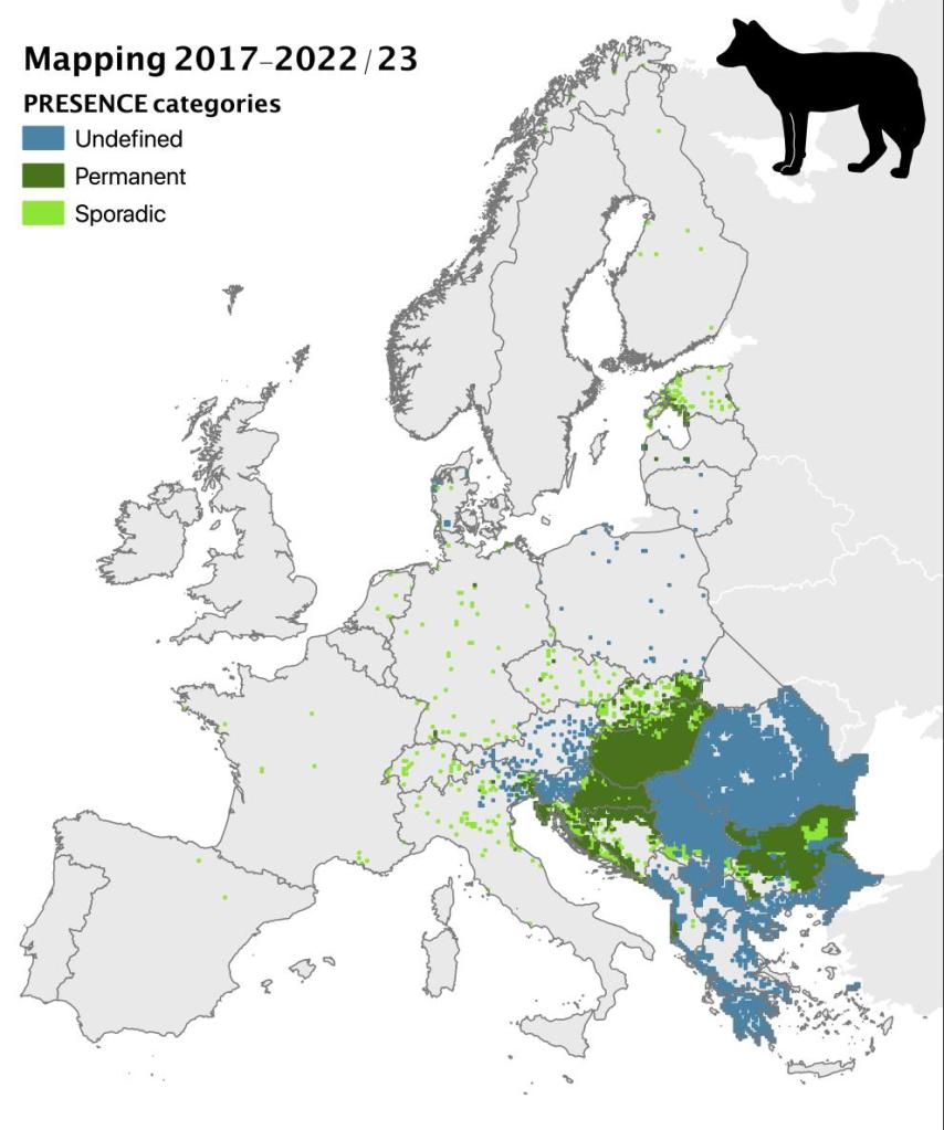 Distribuzione: Il lupo è presente in tutti i 34 Paesi censiti, compresi Belgio e Lussemburgo, in cui la presenza è confermata dal 2016.