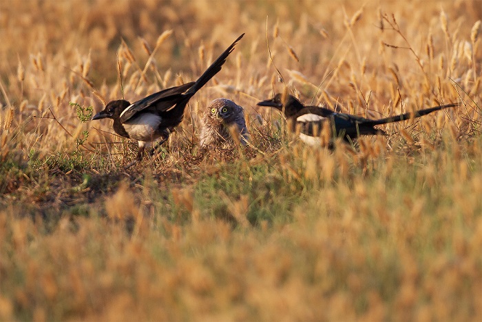 Un esemplare di civetta letteralmente ad occhi spalancati tra due gazze