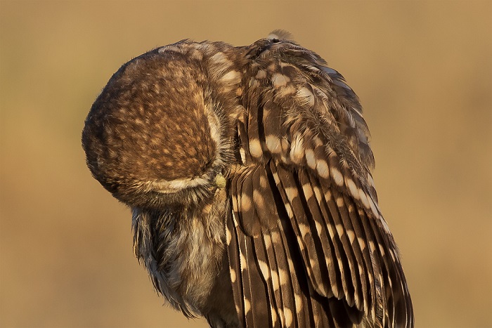 Una civetta colta in un momento “intimo”: la pulizia del piumaggio