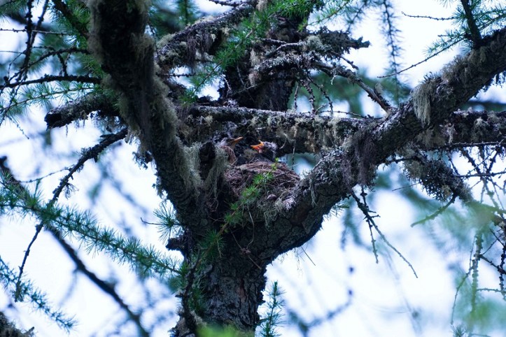 Una cesena nutre un pullo tra i rami di un larice in Valnontey (foto di Ale.Zoc)