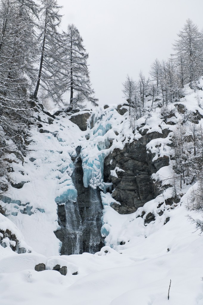 La montagna che sale ripida, un sentiero che si insinua nel bosco innevato, una cascata mezza ghiacciata al centro della scena. Dopo il primo “wow”e un’altra manciata di passi ci accorgiamo subito che il posto è quello giusto.