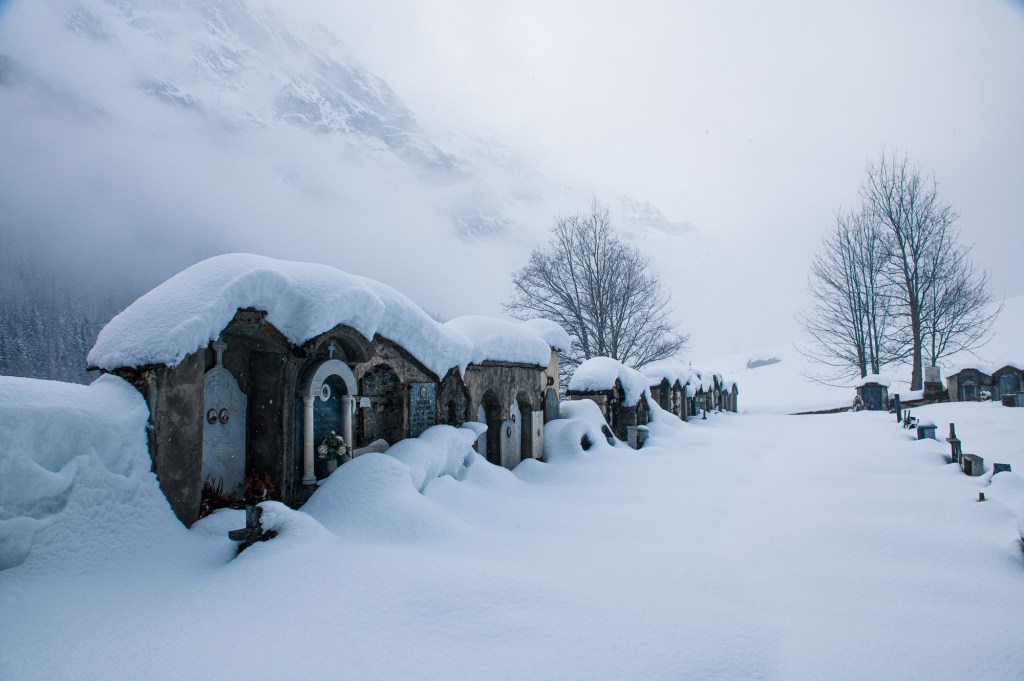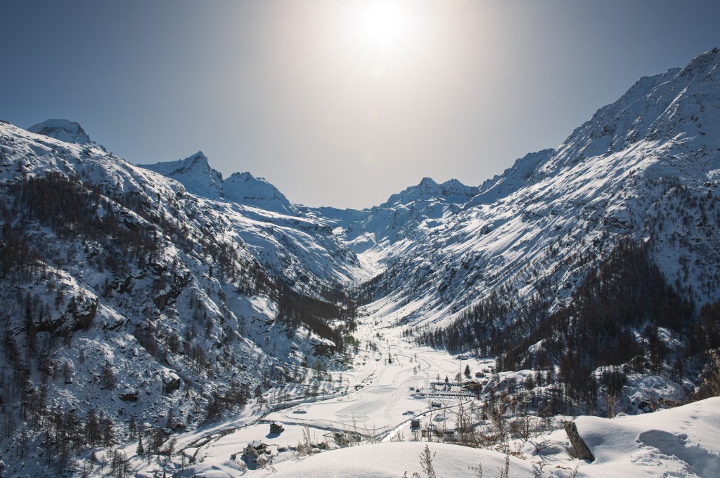 Dopo Introd entriamo nella valle stretta e selvaggia: è inizio febbraio, le strade sono pulite ma i ripidi pendii a lato strada sono di un bianco abbagliante; è mezzogiorno non fa eccessivamente freddo e ha tutta l’aria che di lì a poco ricomincerà a nevicare.