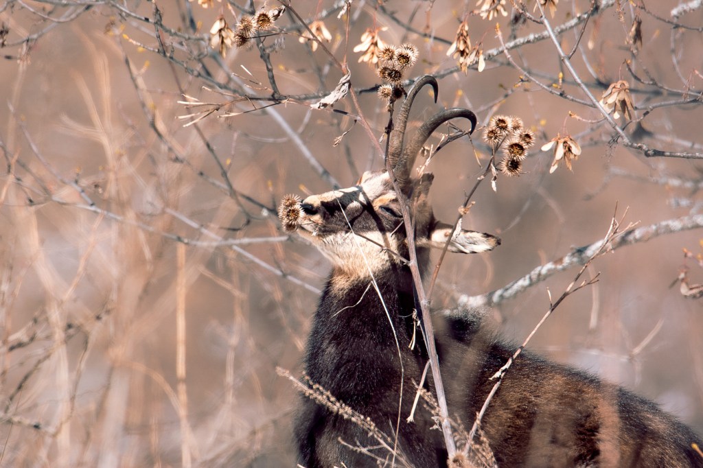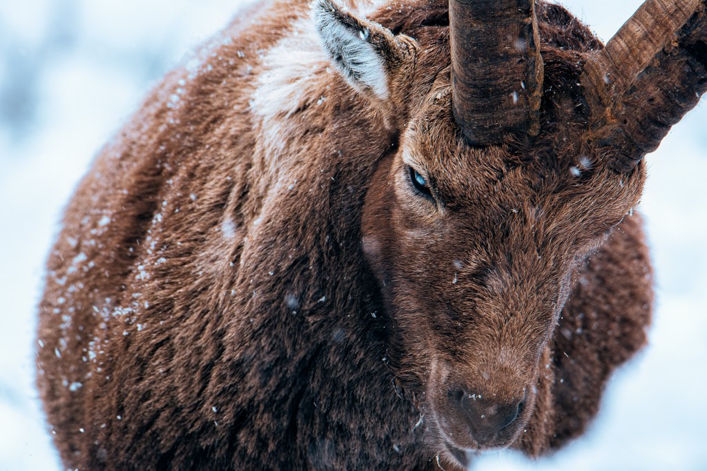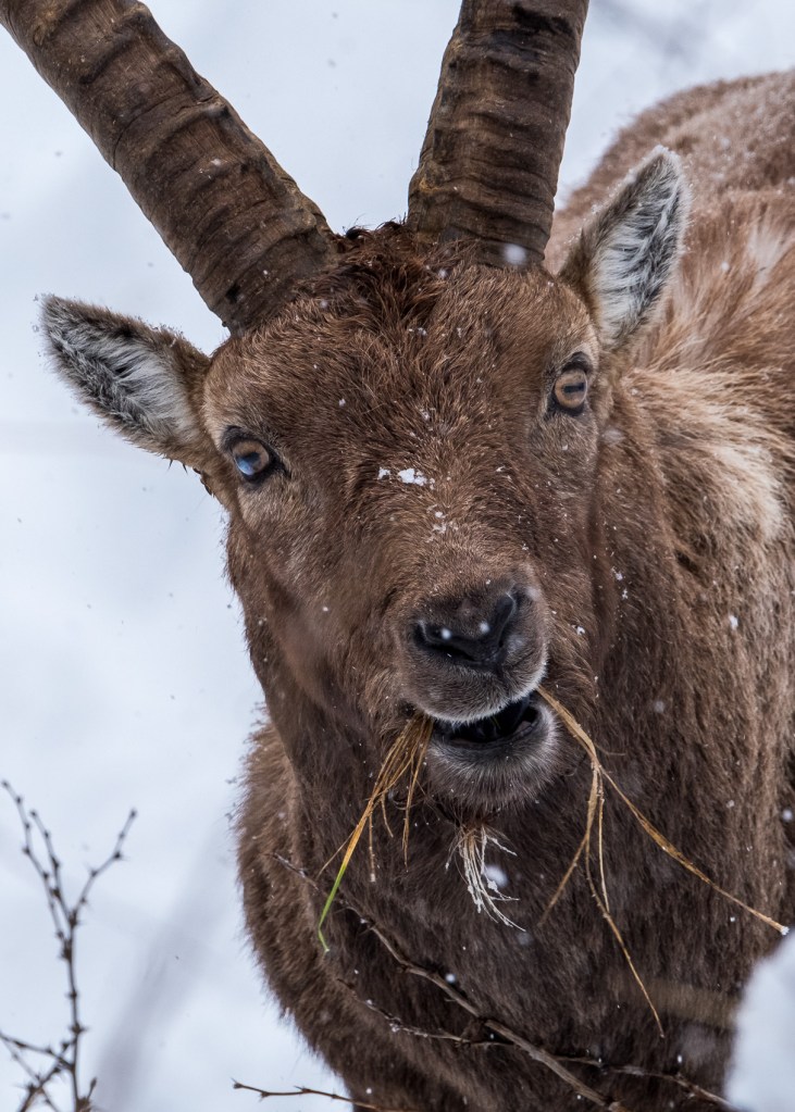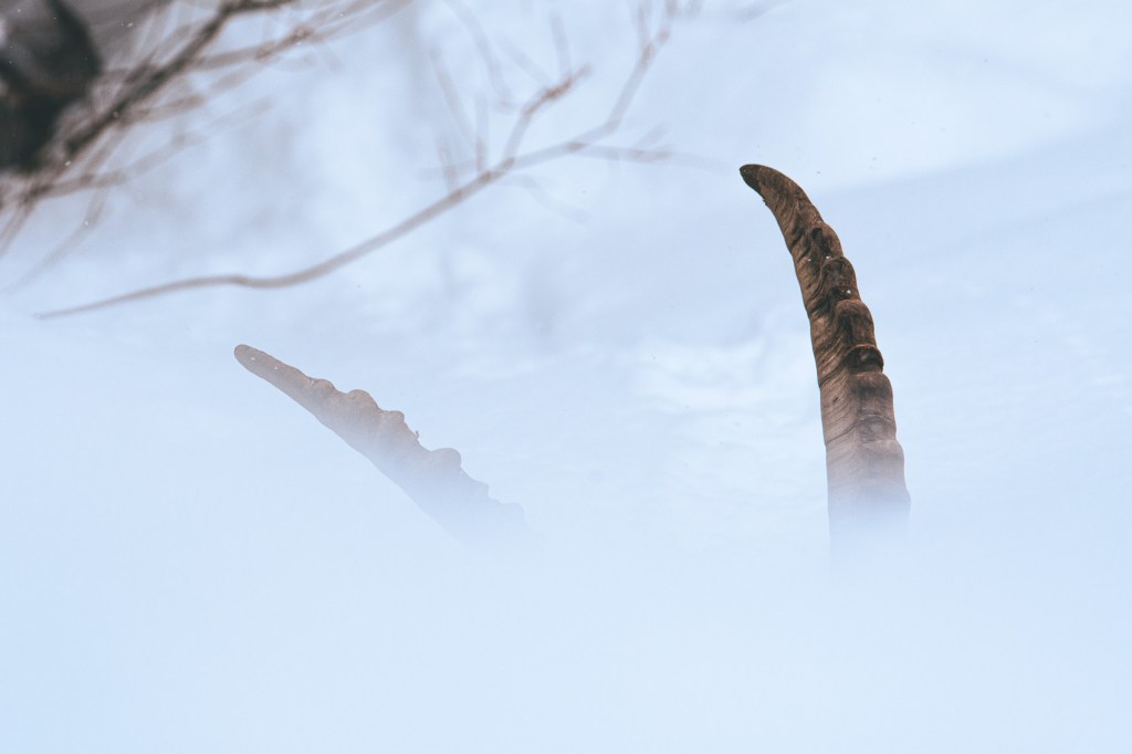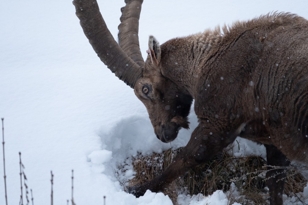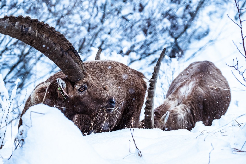 Possenti caproni scavano con gli zoccoli nella neve per poi infilarci il muso e pasteggiare con erba, rametti e germogli liberati dalla coltre bianca.