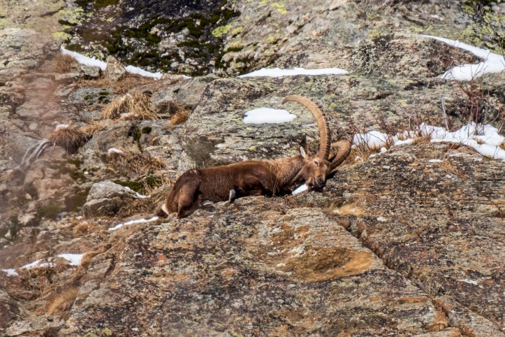 Gli stambecchi invece a patto di mantenersi sul sentiero non si scompongono granché. Questo prato innevato sotto di noi è perfetto per pasteggiare e non vogliono fare la fatica di spostarsi finché noi rimaniamo dove siamo. E’ un do ut des perfetto: loro si fanno fare dei bei primi piani e noi non ci muoviamo da dove siamo.