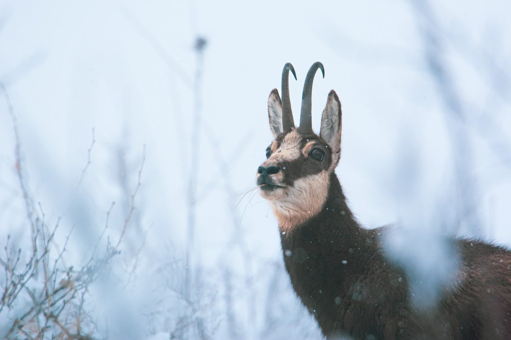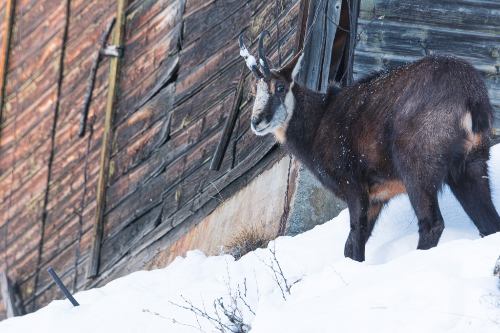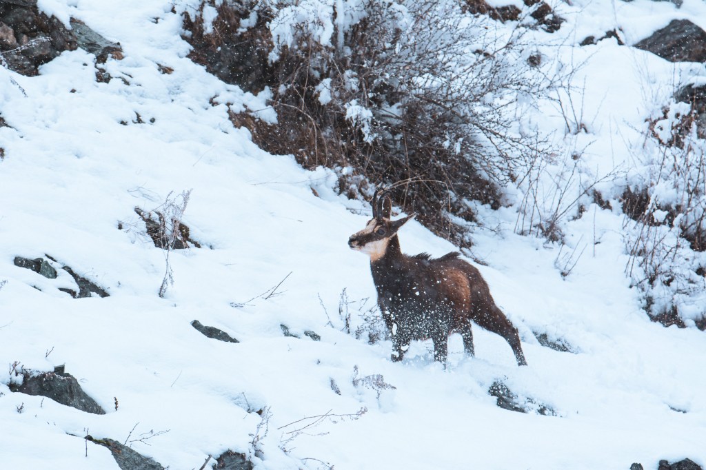 Inforchiamo le ciaspole e cominciamo a salire tranquilli, godendoci il bianco della neve e il nero dei gracchi alpini che ci sorvolano. Si ripete un poco la scena del giorno prima e dunque bastano pochi minuti per imbatterci nei pressi di un capanno in uno stupendo camoscio. Marco e Davide cominciano, alternandosi, a raccontarci del parco e delle abitudini degli animali che vi risiedono, informazioni preziose e avvincenti che non sto a ripetere a pappagallo qui per non spoileravi un’esperienza che vi consiglio caldamente di fare prima o poi con loro.