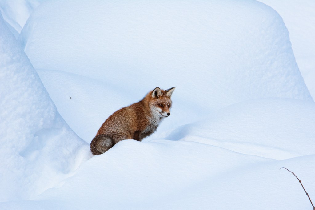 La giornata è splendida, nemmeno una nuvola ma il freddo del mattino a stare fermi è decisamente tagliente su mani e piedi, quindi ci incamminiamo verso il bar per un caffè ma proprio in quel momento vediamo passare Marco seguito da un’allegra comitiva, lo raggiungiamo, ci stringe la mano per salutarci e la sua prima frase è “c’è una volpe”. Nella neve a pochi metri da noi una volpe ci osserva, bellissima.
