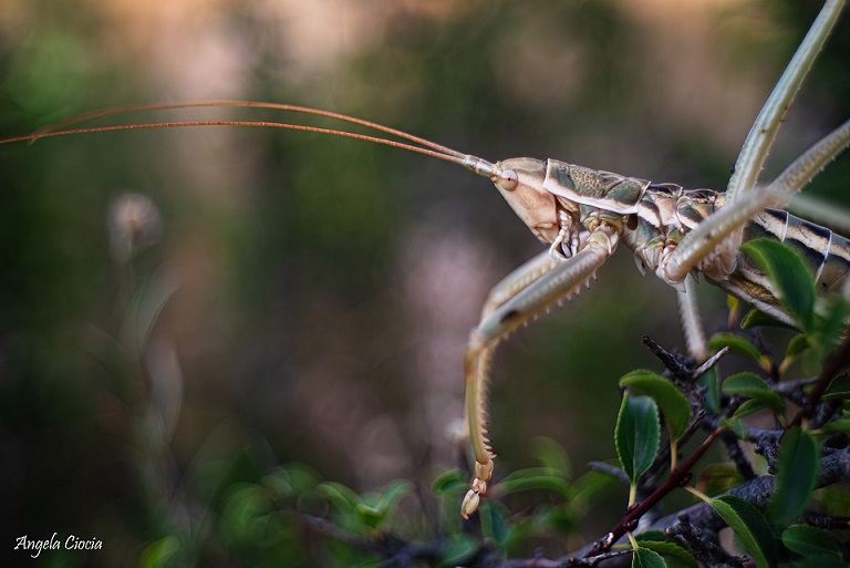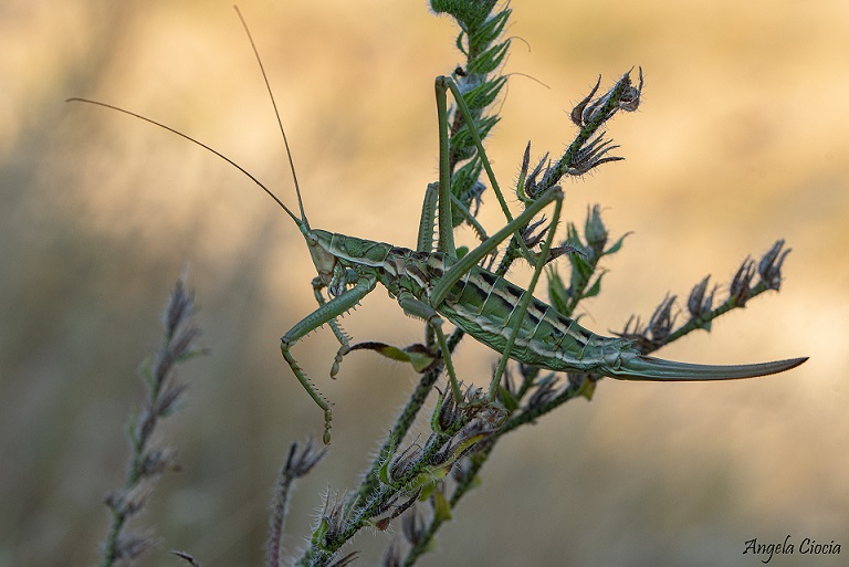 Saga pedo potrebbe essere un misterioso personaggio delle fiabe… ma in realtà è un enorme insetto, uno dei più grandi d’Europa, dal nome volgare un po’ buffo: stregona dentellata! Può raggiungere i 12 cm di lunghezza, di cui una buona parte è occupata da una “sciabola” chiamata ovopositore, una specie di ago che serve per deporre le uova nel terreno.