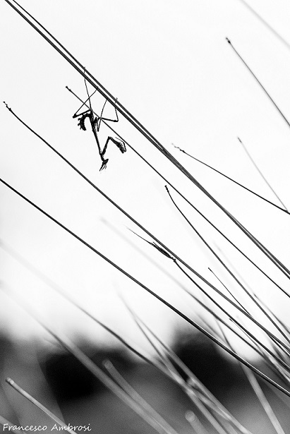 Osservo il suo immobilismo, la lunga attesa tra gli steli d’erba secchi: possiede un’eleganza che ha qualcosa di arcano. Il controluce del tramonto disegna il suo profilo sottile, facendone risaltare la struttura quasi trasparente. Ogni suo gesto pare studiato, armonico, in perfetta sintonia con la luce che scivola via dal giorno.