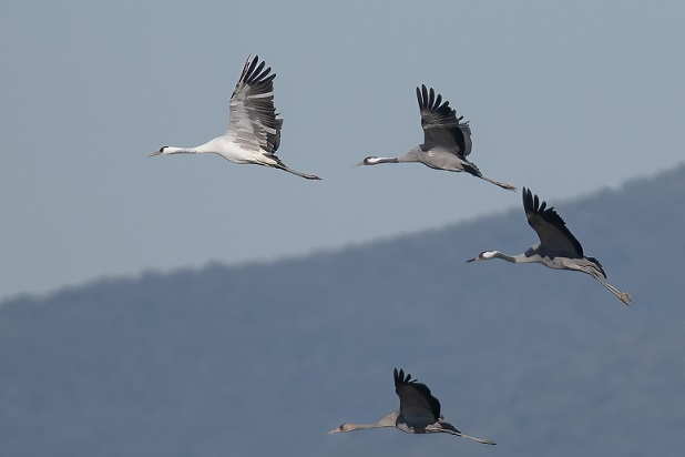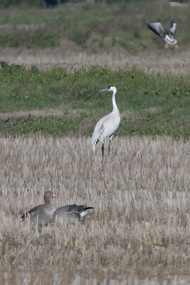 Può bastare? Ancora no! Perché tra il folto stormo di gru svernanti come ogni anno in Maremma, qualcuno ha notato un individuo chiaro, troppo chiaro: una gru cenerina leucistica (Grus grus)! Nello scatto qui sotto potete apprezzare la differenza di colore.