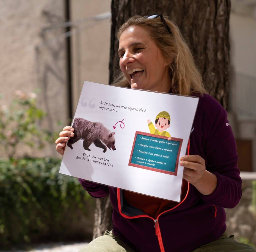 Sono arrivata in Abruzzo nel 2005 e diciamo che sono ancora lì. Per diversi anni ho fatto ricerca con l’Università di Roma e poi ho lavorato come tecnico faunistico al Parco. Negli ultimi dieci anni, però, il mio percorso si è arricchito e trasformato: si è aperto all’educazione in natura, allo storytelling, all’interpretazione ambientale, alla lettura degli albi illustrati, al teatro e alla fotografia. E così, come mi piace dire, ho cercato di diventare una cantastorie di natura. E soprattutto, di orsi.