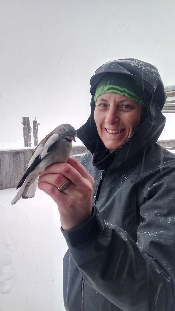 Chiara con un fringuello alpino, uno dei protagonisti del libro