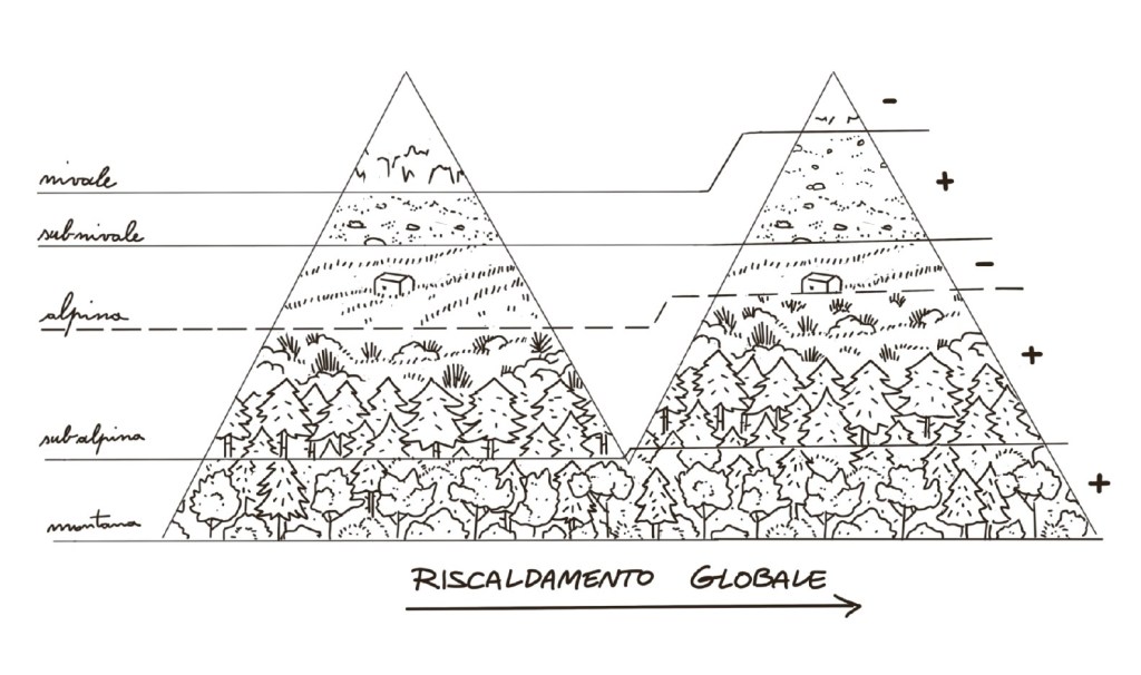 Si tratta di un viaggio in salita, in cui accompagno il lettore a scoprire la “scala mobile per l’estinzione”, ovvero la migrazione verticale delle specie che vivono in montagna, in risposta al cambiamento climatico. Un viaggio quindi che parte dai boschi misti di media montagna, entra nelle foreste di conifere, uscendo poi nella luce accecante delle praterie alpine, per passare nella fascia degli ambienti rocciosi e poi in quella nivale dei ghiacciai, per arrivare infine sulla cima. In ognuno di questi ambienti scopriremo, attraverso una specie animale caratteristica, le diverse sfaccettature di questi mutamenti in atto.